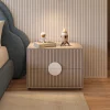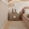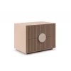 La Mesa de Noche Nilo combina diseño minimalista con detalles funcionales inteligentes. Su frontal con formas elípticas y sus proporciones contenidas la hacen adecuada para dormitorios con estilo sereno y ordenado.